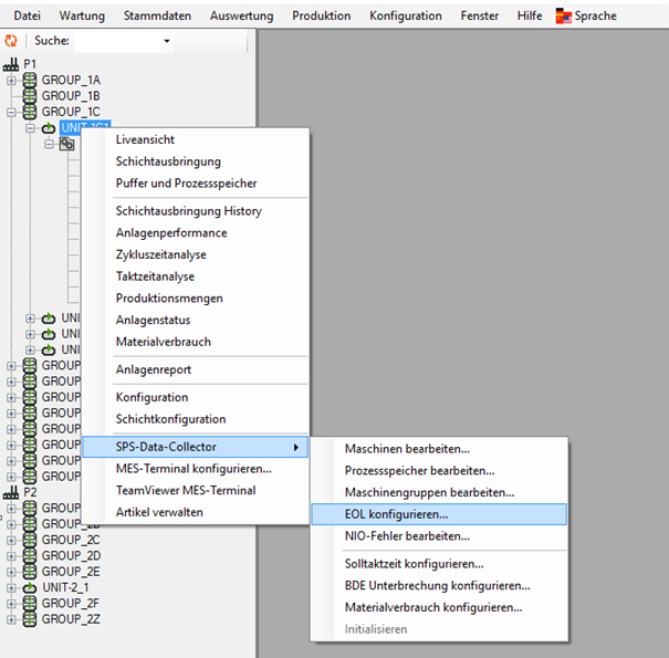 Klicken Sie mit der rechten Maustaste auf die Anlage die bearbeitet werden soll und wählen Sie unter dem Punkt SPS-Data-Collector das Menü EOL konfigurieren.